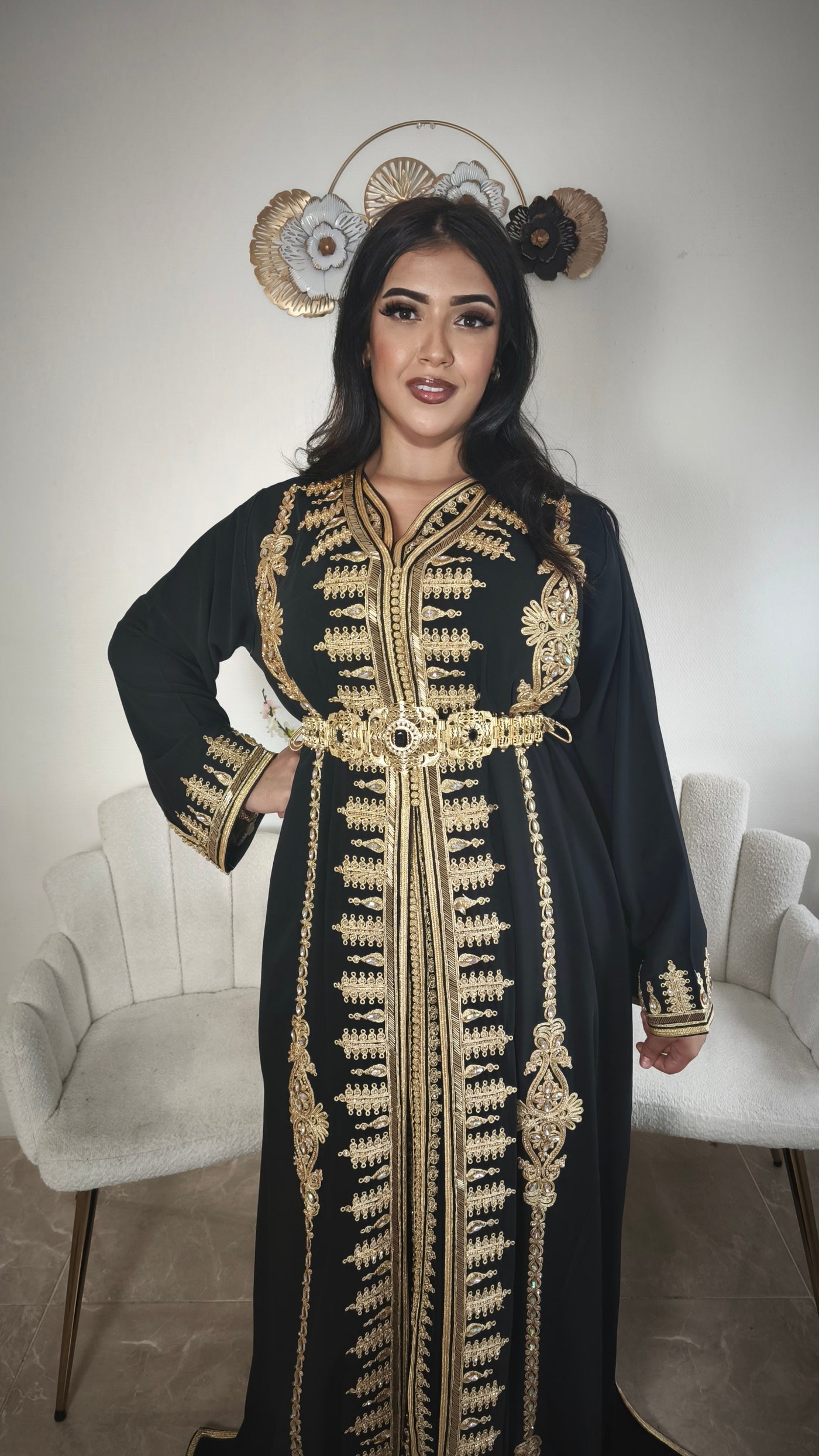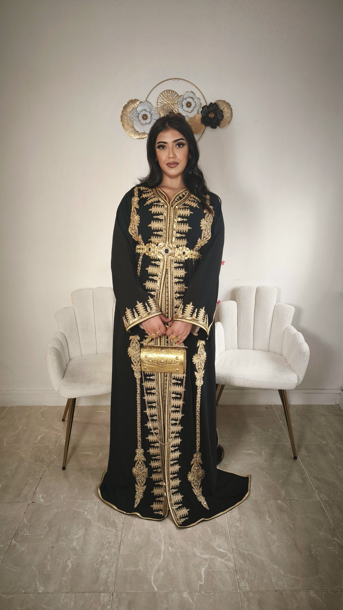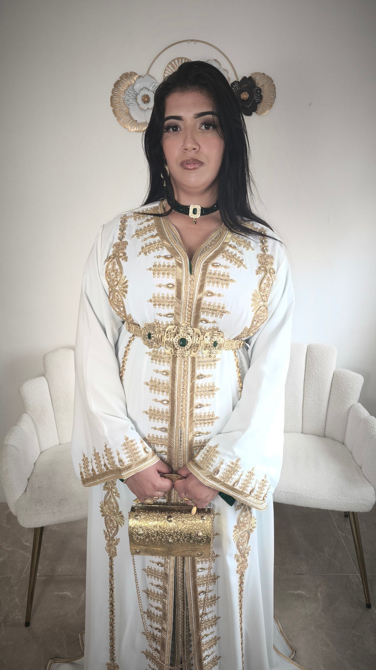 tissu crêpe de soie et le dessus satin de soie Broderie Lm3elem se9elli l7or et les perles cousus totalement à la main.