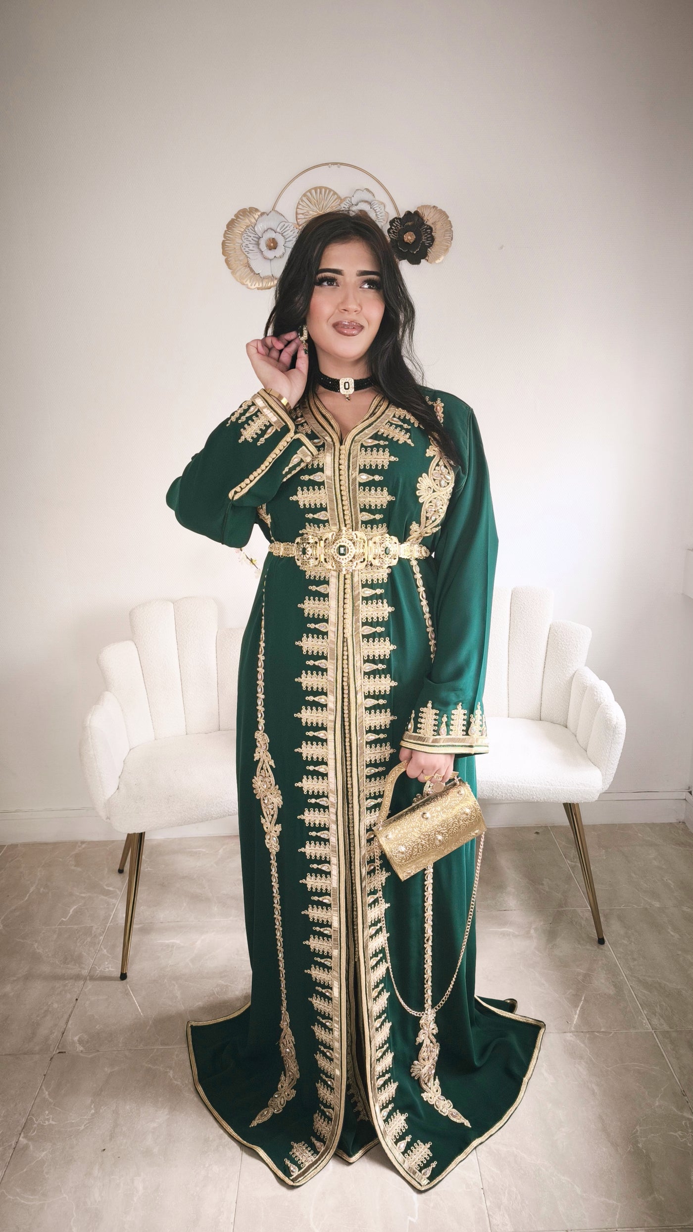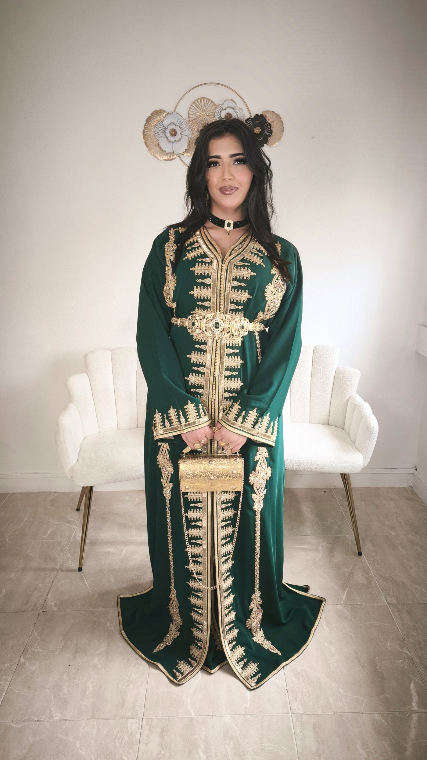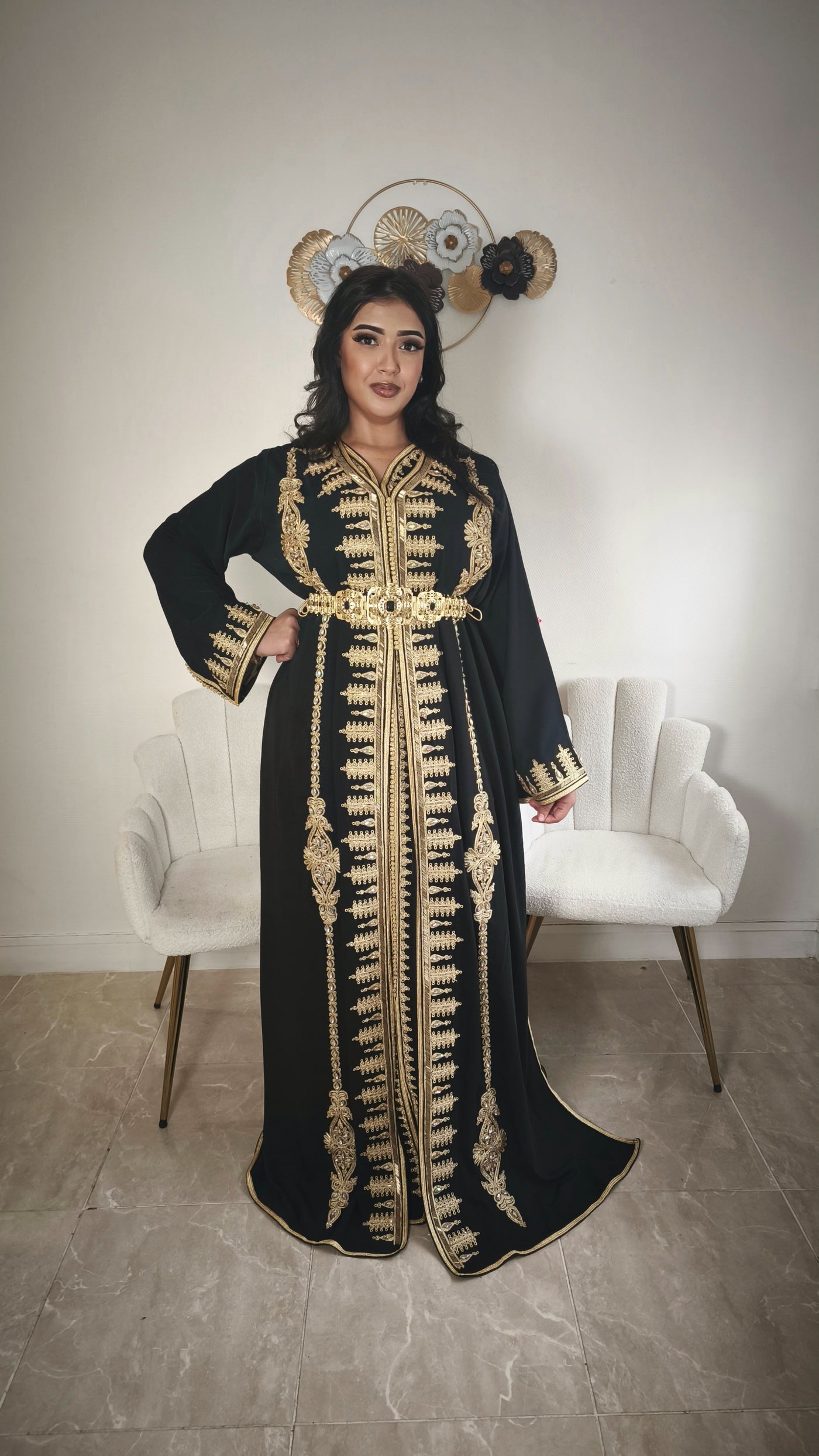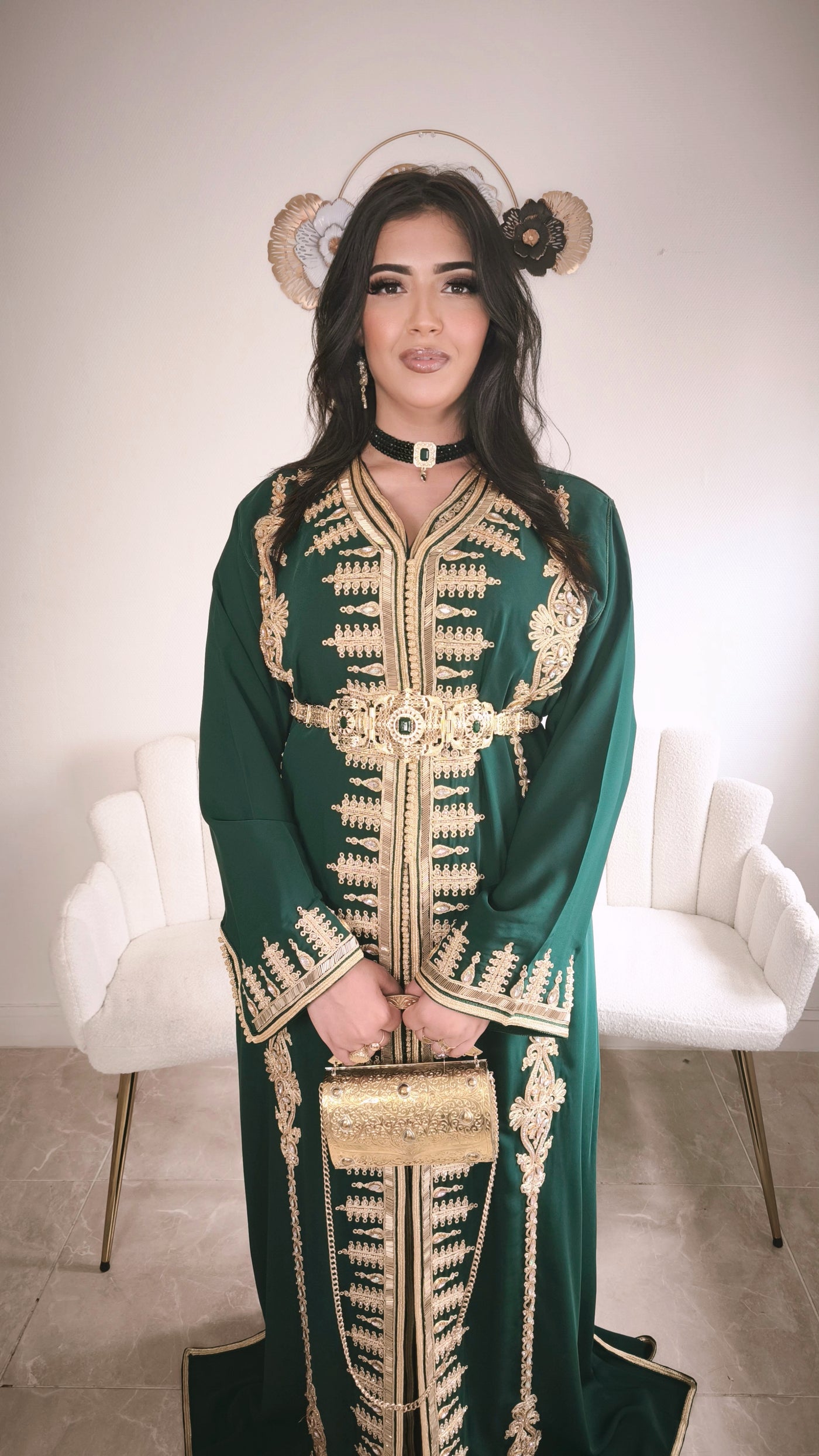 tissu crêpe de soie et le dessus satin de soie Broderie Lm3elem se9elli l7or et les perles cousus totalement à la main.